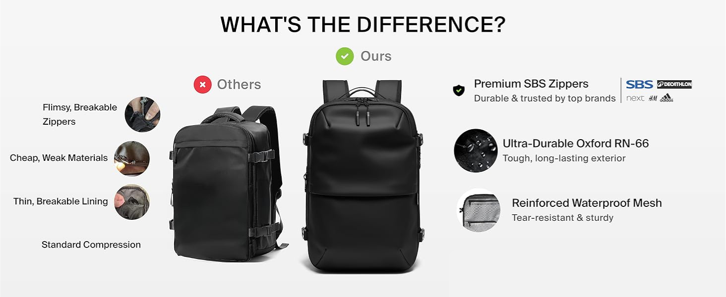 Our bag uses premium leak-proof valves, reinforced seams, and thick compression material tested for 300+ uses. Cheap versions fail after a few trips — ours doesn’t.
